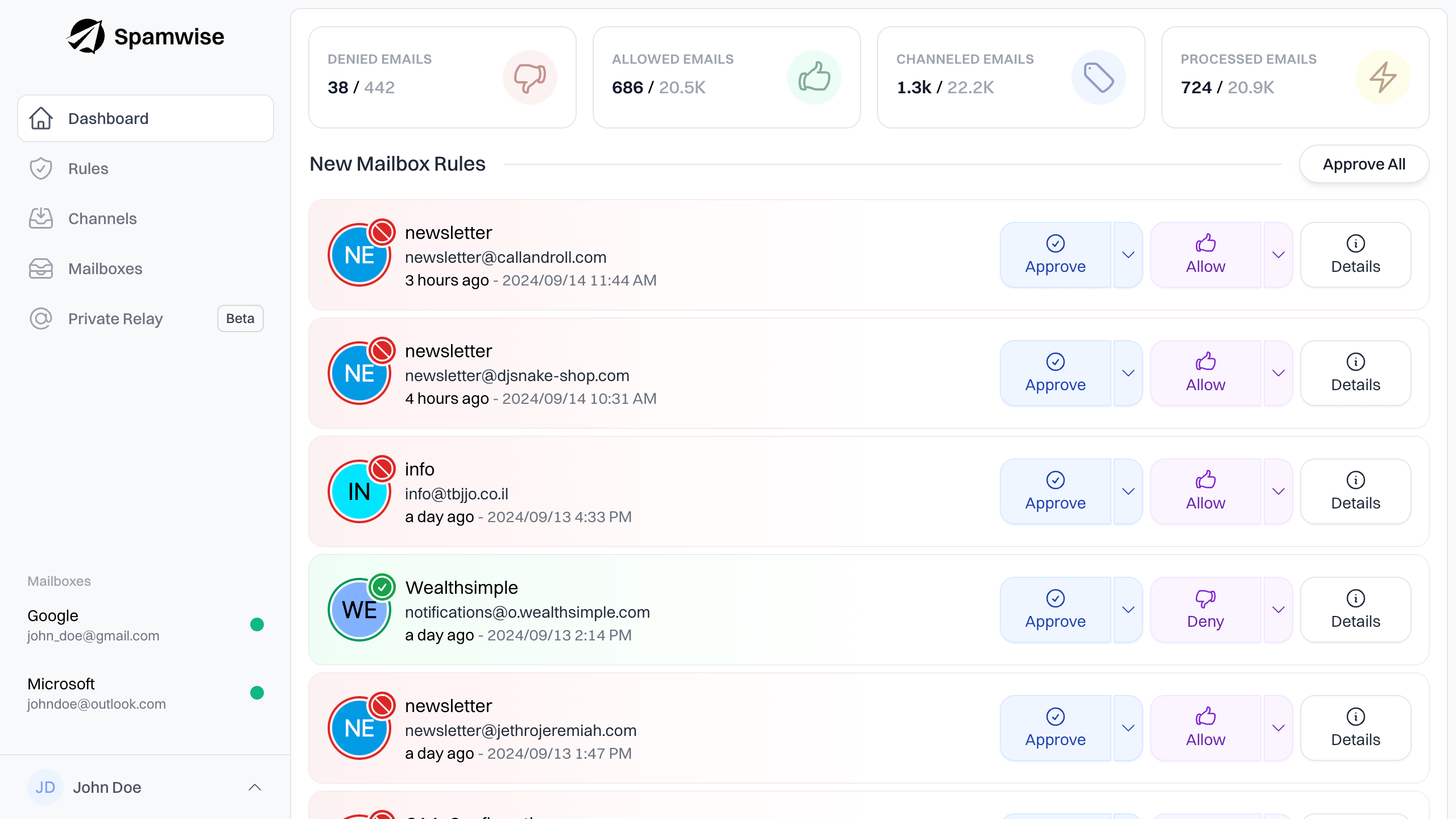 Define your own categories and Spamwise automatically sorts every email into the right folder. No rules to configure, no filters to maintain—just organized email.